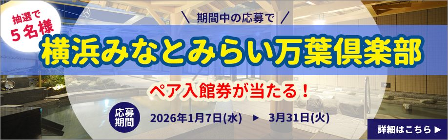 プレゼント企画第11弾として、期間中にご応募いただいた方の中から抽選で5名様に「横浜みなとみらい万葉倶楽部」のペア入館券をプレゼントいたします! 申込み方法はLINE公式アカウントの友だち登録をして専用の申込みフォームから必要事項を入力して送信するだけ!皆様からのご応募お待ち...